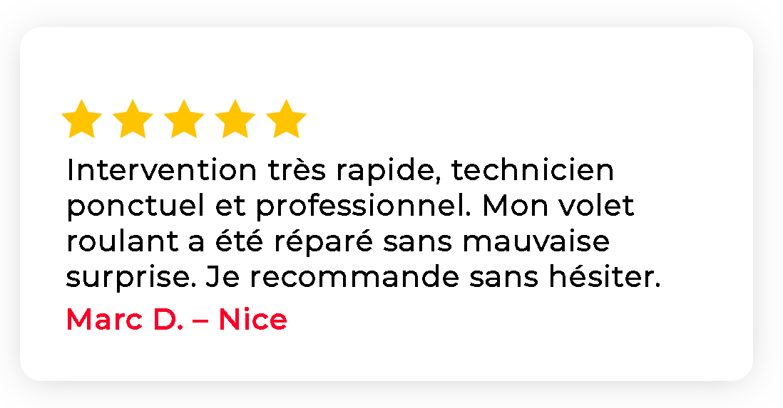 Le coût d’une réparation volet roulant dépend du type de panne et des pièces à remplacer. Un dépannage simple comme un volet roulant bloqué peut être plus rapide et moins coûteux qu’un remplacement complet de moteur ou de lames. Nous proposons toujours un devis gratuit et détaillé avant intervention, afin que vous puissiez évaluer le prix selon votre situation. Notre politique est transparente : les tarifs sont adaptés à la complexité de l’intervention, et nous utilisons uniquement des pièces certifiées pour garantir la durabilité de la réparation.